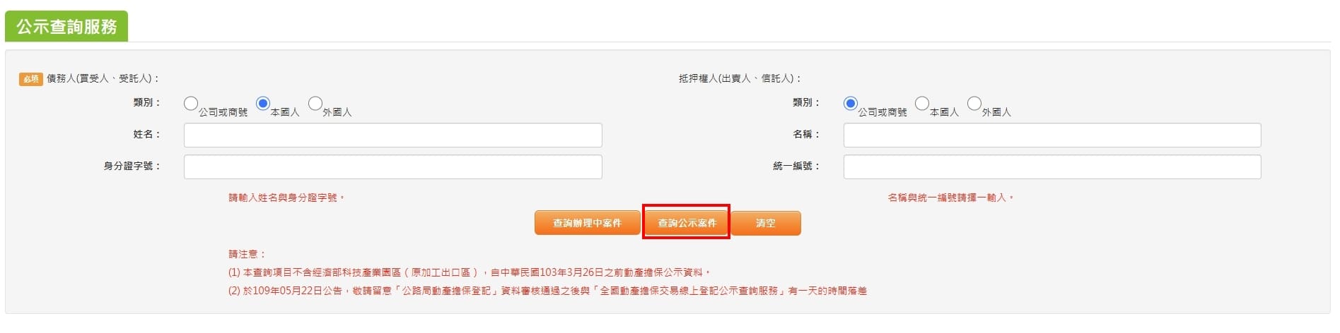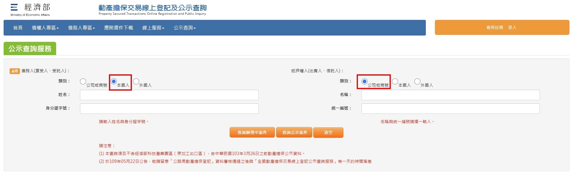 - 進入「經濟部動產擔保交易線上登記及公示查詢」或監理服務網。